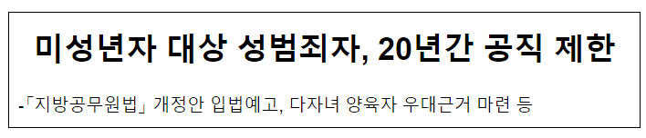 □ 미성년자를 대상으로 성범죄를 저질렀어도, 공무원 임용을 영구적으로 제한하는 것은 과도하다는 헌법재판소의 결정에 따라 앞으로 미성년자 대상 성범죄의 경우 20년간 공직 임용이 제한된다.