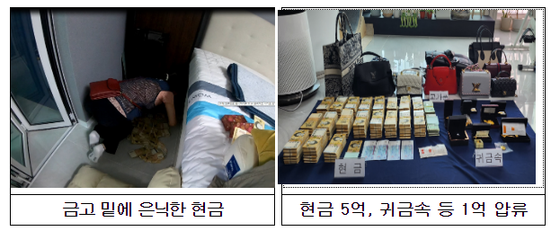 - 은닉한 현금다발 5억원과 귀금속·명품가방 등 압류하여 총 6억 원 징수