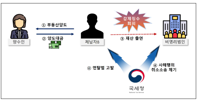 - 비영리법인을 상대로 체납자가 출연한 재산(부동산 양도대금 등)에 대해 사해행위취소소송 제기하고 체납자와 비영리법인을 체납처분 면탈범으로 고발