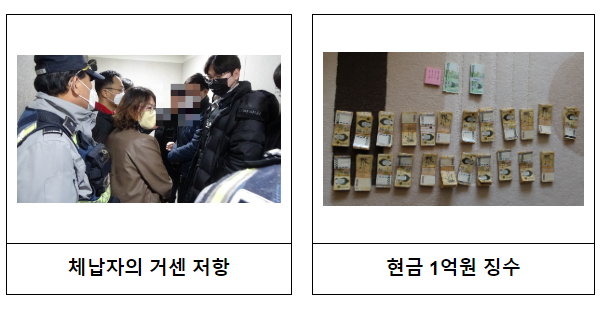 ⇨ 수차례 잠복·탐문하여 체납자가 가족 명의 아파트에 실거주하는 것을 확인, 자해, 욕설, 협박 등에 맞서 개인금고에 은닉한 현금 1억원 징수