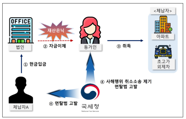○ 제조업을 영위하는 A는 법인자금 유출에 대해 부과된 소득세를 체납하고 본인이 보유하고 있는 자금을 동거인이 대표로 있는 법인의 계좌를 경유하여 동거인에게 이체하는 방식으로 재산 은닉