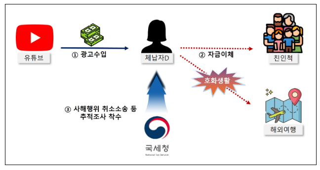∎ D는 유튜버로 매년 구글로부터 수억 원의 광고 수익 등 고소득이 발생되고 있으나 친인척 명의 계좌로 재산을 은닉하고 해외여행 등 호화생활 영위