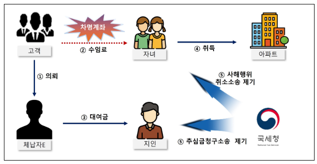 ∎ E는 법무사로 수임료를 자녀 명의 계좌로 받아 재산을 은닉하고 자녀 명의 아파트 취득자금으로 사용하거나 지인에게 대여하여 강제징수 회피