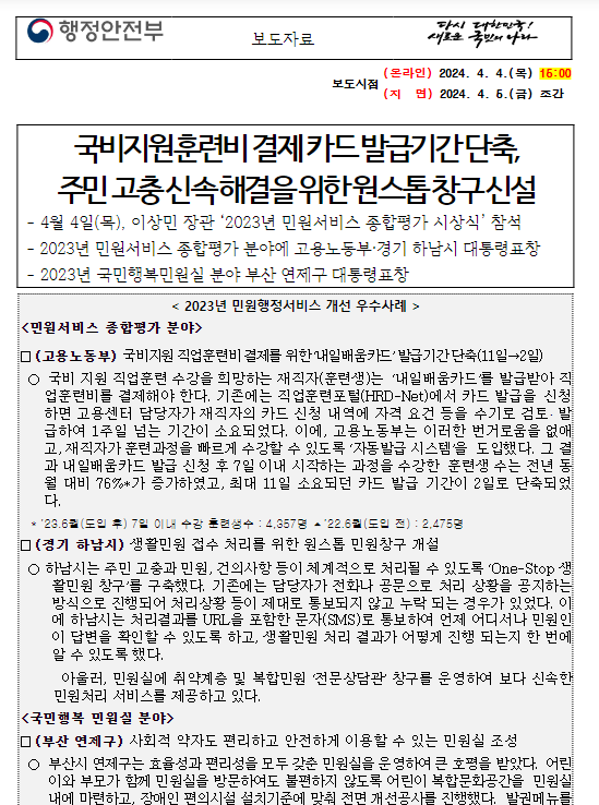 - 2023년 민원서비스 종합평가 분야에 고용노동부·경기 하남시 대통령표창