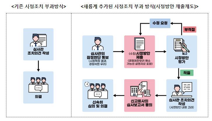 지금까지는 공정위가 경쟁제한적 기업결합에 대한 시정조치를 직접 설계하여 부과해왔으며, 독과점 우려가 매우 큰 경우는 기업결합 금지조치도 부과해왔다. 8월 7일부터는 시정조치를 부과함에 있어 시장 정보를 풍부히 보유한 기업에게 경쟁제한 우려 시정방안을 제출할 수 있는 기회를 부여하고, 제출된 방안을 고려하여 공정위가 시정조치를 부과하는 방식도 추가된다. 이러한 시정방안 제출제도는 다음과 같은 절차로 운영된다.