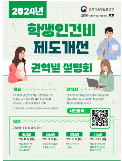 한편 과기정통부는 학생인건비 제도 개선에 대한 현장 공감대를 확산하고, 기관단위 관리기관 지정 신청 시 필요한 사항들을 안내하기 위해 「안정적인 연구생활장려금 지원을 위한 제도설명회」를 개최한다.