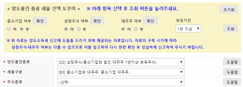 * 중소기업 여부, 상장주식 여부, 대주주 여부, 주식 보유기간