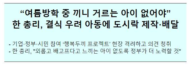 □ 한덕수 국무총리는 8월 8일(목) 결식 우려 아동을 위한 사회적기업 ‘행복도시락’을 찾아 여름 방학 중 끼니를 거를 위험이 있는 아이들을 위한 도시락 제작 과정을 지켜보고 직접 배달에 참여했다.