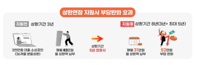 심사 후 지원이 결정되면, 최대 5년(60회차)까지 분할 상환기간이 추가로 부여된다. 예를 들어 당초 원리금 분할 상환기간인 3년인 경우에 5년을 추가하면 8년으로 전환되어 월 상환금액이 크게 줄어들 것으로 기대된다.