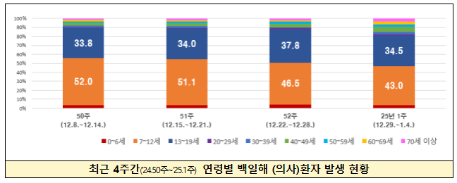 연령별로는 모든 연령층에서 환자수가 증가하고 있는 상황으로, ’25년 1주차(’24.12.29.~ ’25.1.4.) 기준으로 13∼18세(177.4명)에서 가장 발생이 높았고, 7∼12세(161.6명), 19∼49세(129.1명) 순*으로 발생하면서 학령기 아동 청소년층 전파가 유행을 주도하고 있다.