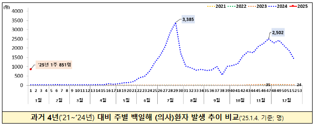 * 최근 4주간 (의사)환자수 : (50주) 2,136명 → (51주) 1,862명 → (52주) 1,366명 → (’25.1주) 851명