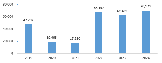2024년 전체 창업은 국내외 경기둔화와 3高(고금리·고환율·고물가) 지속에 따른 소비위축, 저출산‧고령화 지속 등이 창업에 부정적으로 작용하여 전년대비 4.5%(55,712개) 감소한 118만 2,905개*로 집계되었다.