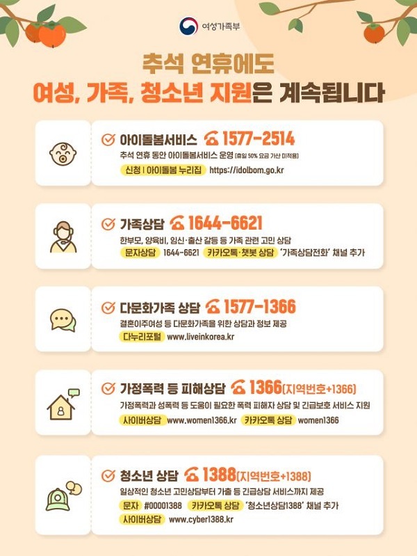 여성가족부는 추석 연휴 기간에도 여성긴급전화(1366), 가족상담전화(1644-6621), 청소년상담전화(1388), 아이돌봄서비스(1577-2514)를 운영하고 청소년쉼터를 24시간 개방·운영하는 등 민생 안정 서비스를 차질 없이 지원한다고 13일 밝혔다.
