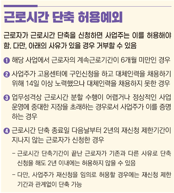 * 허용 예외 사유: ①계속근로기간 6개월 미만인 근로자가 신청한 경우, ②대체인력 채용이 곤란한 경우, ③업무성격 상 근로시간 분할 수행이 곤란한 경우, ④정상적인 사업 운영에 중대한 지장이 있는 경우, ⑤근로시간 단축 후 2년이 경과 하지 않은 경우