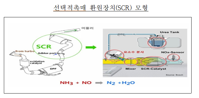 ㅇ SCR은 자동차 배출가스에 요소수(NH3)를 분사하여 NOx를 선택적으로 환원하여 질소(N2)와 물(H2O)로 변환시키는 후처리장치이며, 주로 유로6 차량에 EGR과 함께 설치됨
