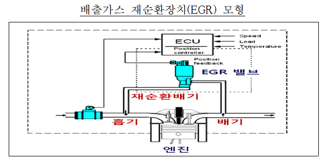 ㅇ EGR은 엔진에서 연소된 배출가스의 일부를 연소실로 재유입시켜 연소 온도를 낮춤으로써 NOx 배출량을 줄이는 장치이며, 주로 유로5 차량에 설치됨