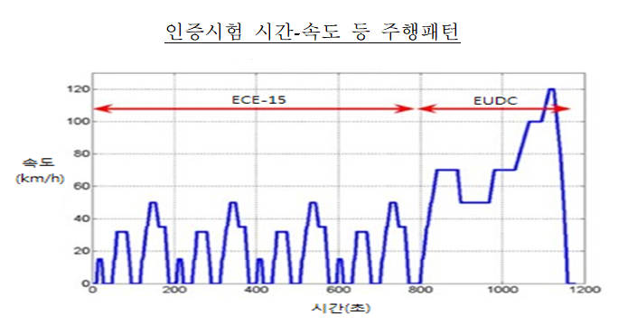 □ (NEDC 시험조건) 외부 온도 20~30℃로 유지시키고 냉난방장치 가동을 중단한 상태에서 실내의 차대동력계 위에서 시가지주행구간(ECE-15) 4회 반복 후 고속주행구간(EUDC) 1회 운행으로 정해진 주행모드 및 정해진 속도로 약 1,200초(20분) 동안 총 11km의 주행을 하고, km당 평균 배출가스량을 측정함