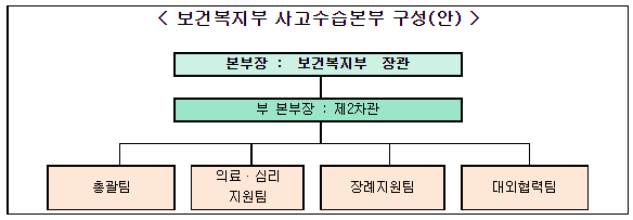 ○ 총괄팀, 의료·심리지원팀, 장례지원팀, 대외협력팀 총 4팀으로 구성하고, 본부장은 복지부 장관, 부본부장은 제1·2차관이 맡게 된다.