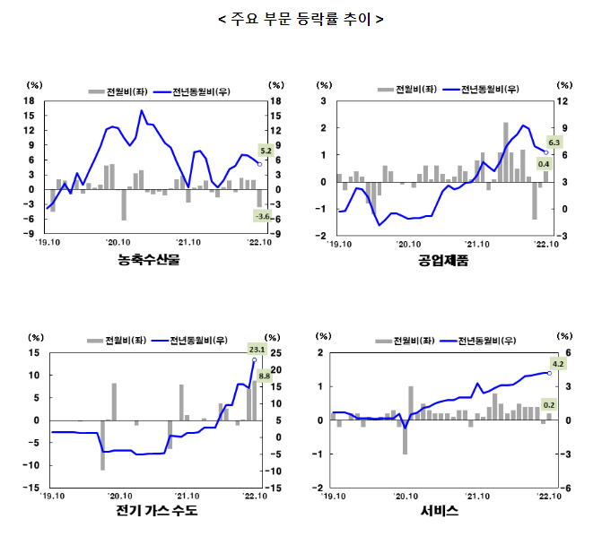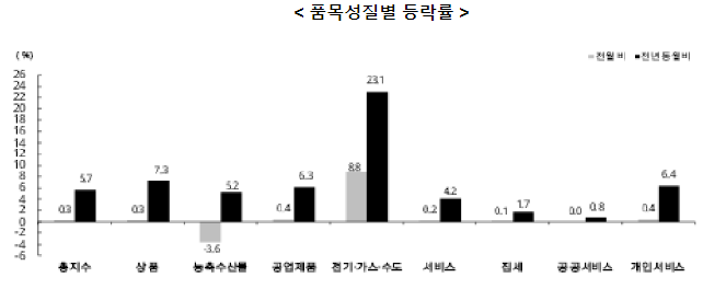 ◦ 전년동월비는 서비스, 공업제품, 전기·가스·수도, 농축수산물이 모두 상승하여 전체 5.7% 상승