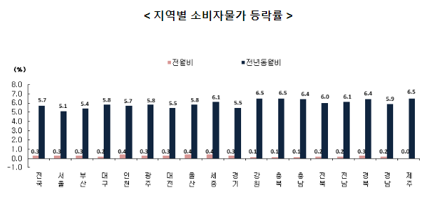 - 전년동월대비로는 제주는 8.0%, 대전, 충북은 7.0%, 인천은 6.8%, 서울, 대구 등 8개 지역은 6.2~6.7%, 세종, 전북, 경남은 6.0%, 광주는 5.9%, 부산은 5.8% 각각 상승