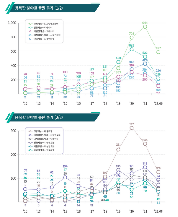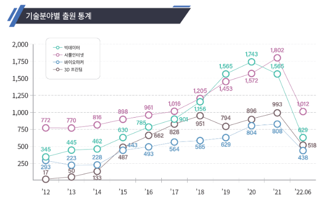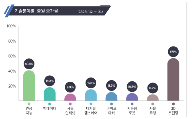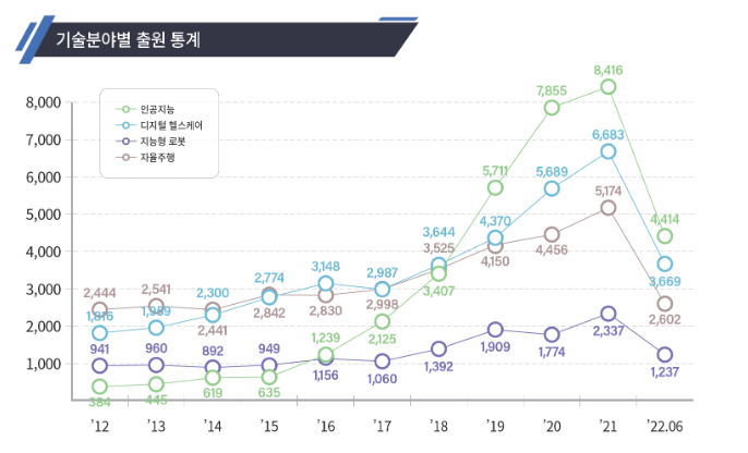 ㅇ 인공지능 분야는 연평균 41%(’12년 384건 → ’21년 8,416) 증가하였으며, 디지털건강관리 분야의 성장률도 16%(’12년 1,816건 → ’21년 6,683건)로 높은 편이었다.