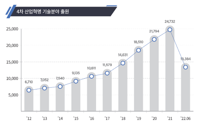 ㅇ 4차 산업혁명 관련 기술의 전체 출원을 보면, ’12년 6,710건에서 ’21년 24,732건으로 10년간 3.7배 증가하였다. 같은 기간 전체 특허출원은 1.2배 증가(’12년 20만건 → ’21년 24만건)한 것에 비해 높은 성장률을 보였다.