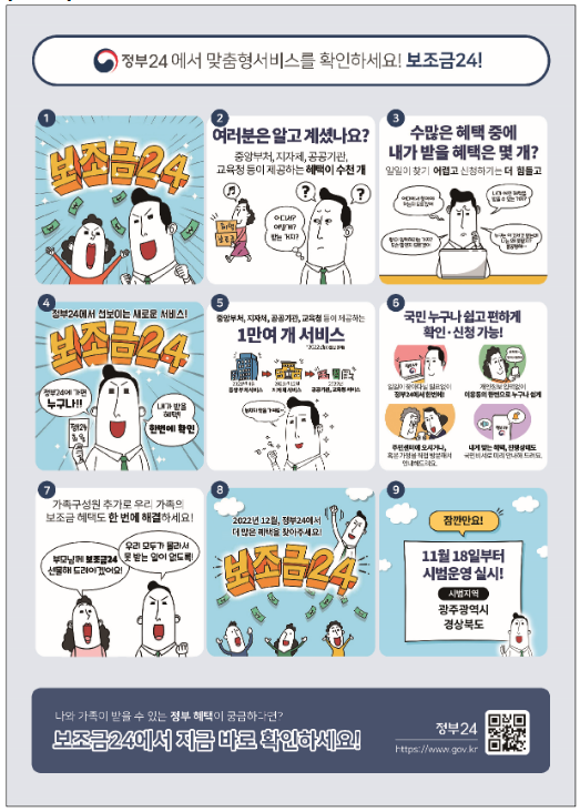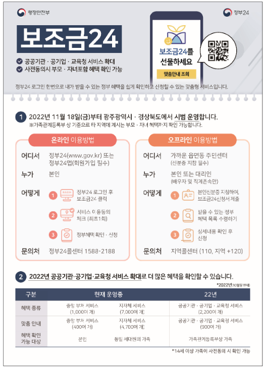 □ 이와 관련해 행정안전부(장관 이상민)는 11월 18일(금)부터 12월 7일(수)까지 광주광역시와 경상북도 2개 광역시·도*에서 공공기관‧공기업‧교육청의 혜택까지 확대한 보조금24를 시범운영한다고 밝혔다.