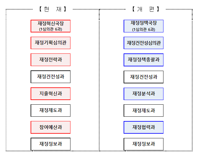 1 (재정분석 및 건전성관리 강화) 재정정책의 총괄적인 수립과 관리를 위해, 재정혁신국을 재정정책국으로 개편하고, 재정기획심의관을 재정건전성심의관으로 개편하여 재정건전성 지표의 목표를 설정하고 관리하는 등 재정건전성관리 기능을 전담