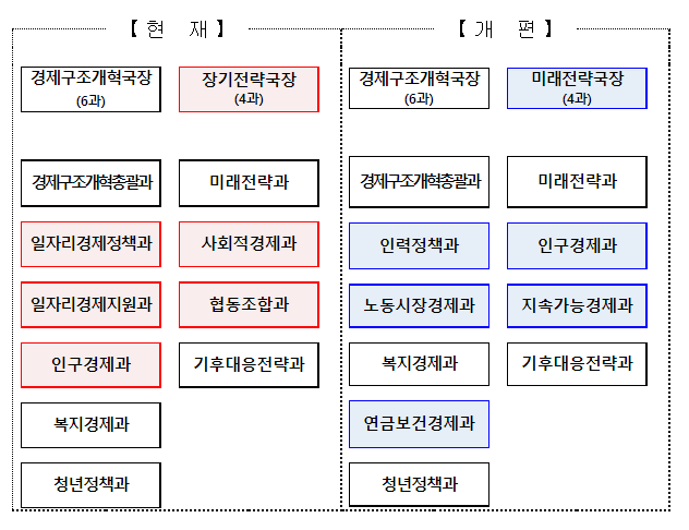 ※ 금번 경제정책관련 부서 직제 개정으로 연금, 노동, 교육 등 구조개혁의 체계적 추진과 우리 경제의 지속가능한 발전 등 미래대비 기능이 한층 더 강화될 것으로 기대됨