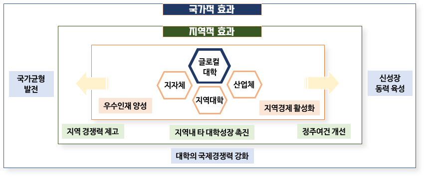 - 글로컬대학은 지역의 변화를 선도적으로 이끌고 지역 균형발전의 거점이 되어 국가균형발전, 나아가 국가경쟁력 제고에 기여할 것으로 기대된다.