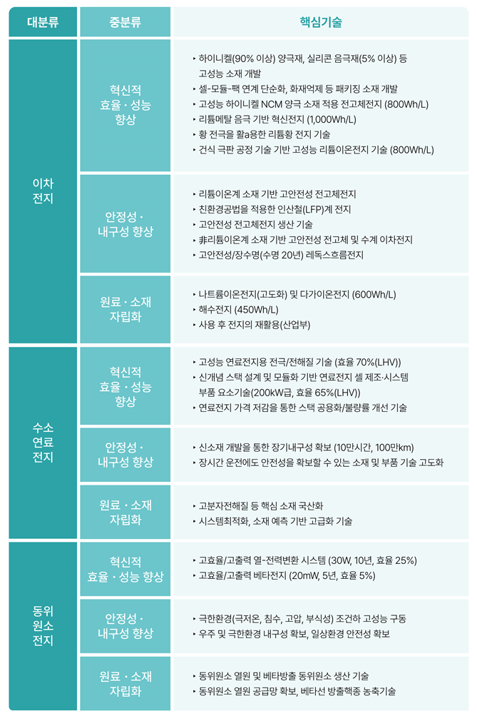 * 정부 R&D 비율: 이차전지(기초원천 24% / 응용개발 68%), 수소연료전지(기초원천 18% / 응용개발 73%), 동위원소전지(기초원천 23% / 응용개발 77%)