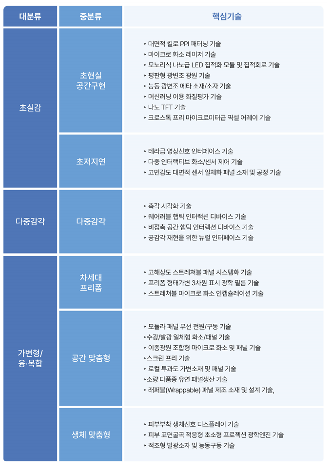 - (화질) 색재현, 선명도, 고해상도 구동 등 실감 영상을 위한 제품 화질을 혁신하기 위한 초격차 원천기술 개발 지원