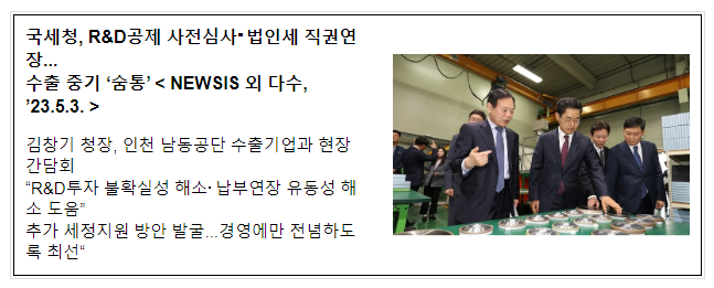 ▶ (해결) 「국세・관세 일괄 세정지원 업무협약」을 체결(’23.2월)하고 우대기업 명단을 상호교환하여, 우수 수출중소기업에 대한 국세・관세 통합 세정지원* 실시