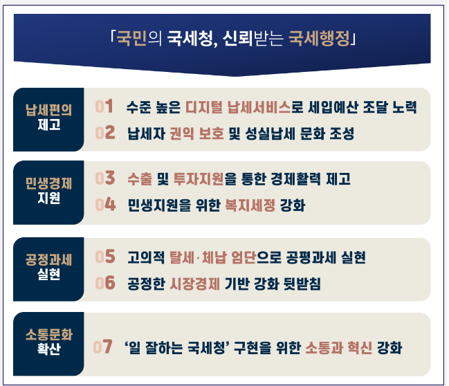 - 신속한 권리구제, 성실납세 우대, 수출지원 확대, 신중한 세무조사, 공정한 시장경제 뒷받침 등 -